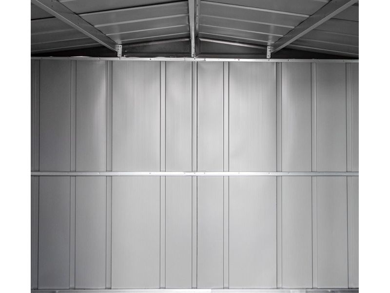 Záhradný domček je vyrobený z elektrolyticky pozinkovaného oceľového plechu. Štýlovú kôlňu dopĺňajú dvojité posuvné dvere, s ktorými sa ľahko manipuluje vďaka madlu na oboch dverách. Vnútorné posuvné dvere, ktoré šetria miesto, navyše uľahčujú otváranie a zatváranie. Zariadenie na visiaci zámok umožňuje zabezpečiť uložené vybavenie (visiaci zámok nie je súčasťou balenia).