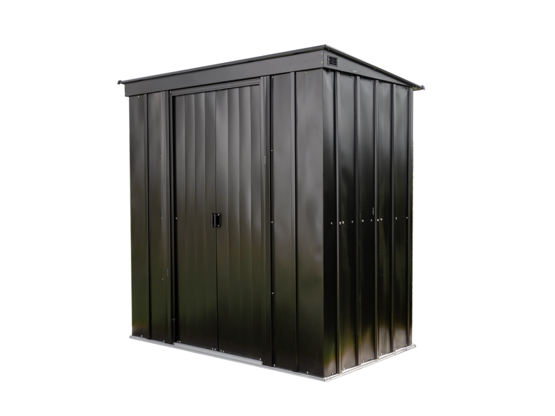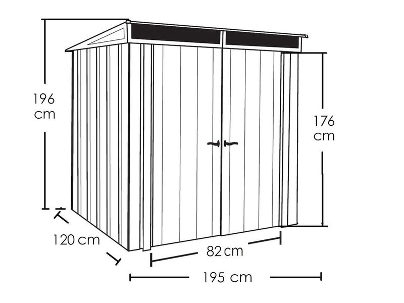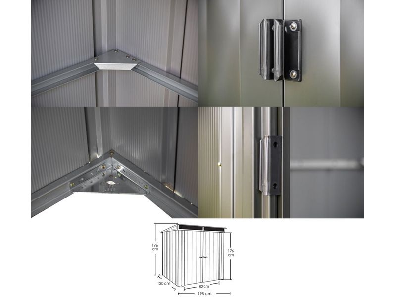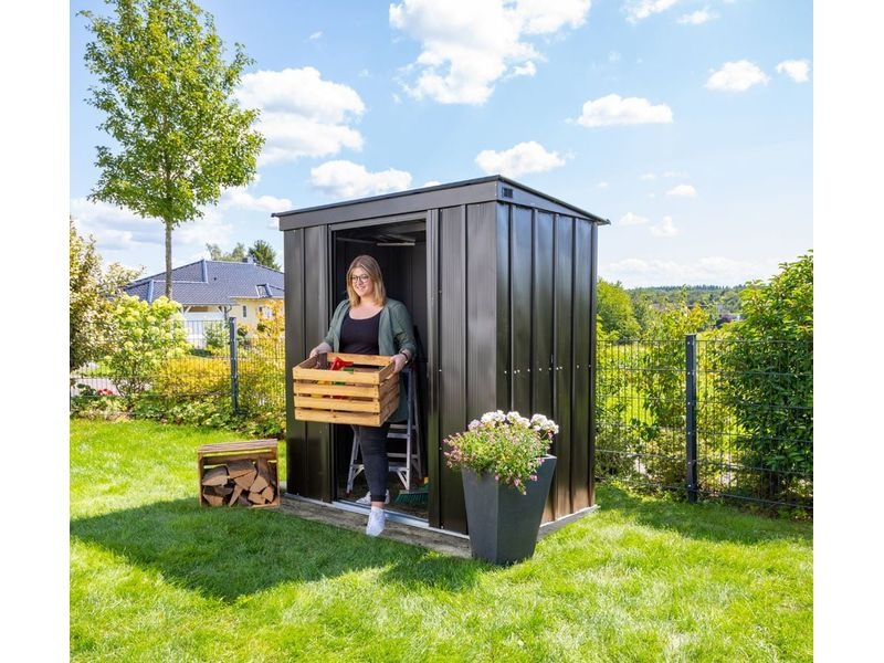 Záhradný domček je vyrobený z elektrolyticky pozinkovaného oceľového plechu. Štýlovú kôlňu dopĺňajú dvojité posuvné dvere, s ktorými sa ľahko manipuluje vďaka madlu na oboch dverách. Zo skladového domčeka môžete navyše prevážať malé aj veľké predmety bez toho, aby vám posuvné dvere prekážali. Zariadenie na visiaci zámok umožňuje zabezpečiť uskladnené vybavenie (visiaci zámok nie je súčasťou dodávky).