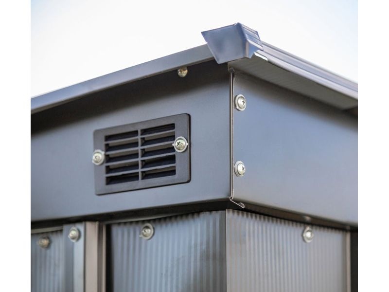 Nadčasový a priestranný kovový prístrešok ponúka stabilnú konštrukciu, ktorá je odolná proti korózii a poškriabaniu. Slúži na uskladnenie záhradkárskych, športových, bazénových, grilovacích, campingových, motoristických a iných potrieb.