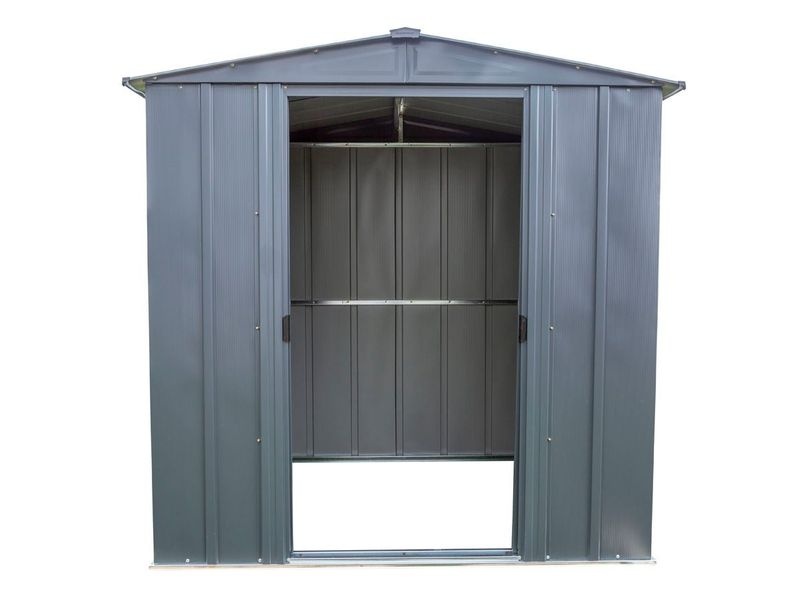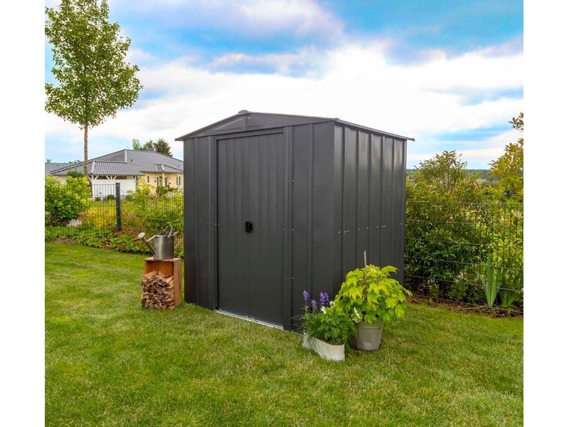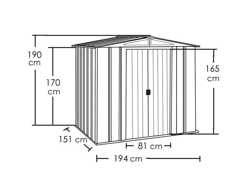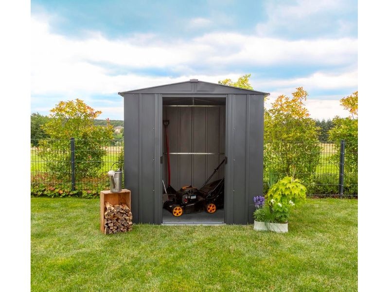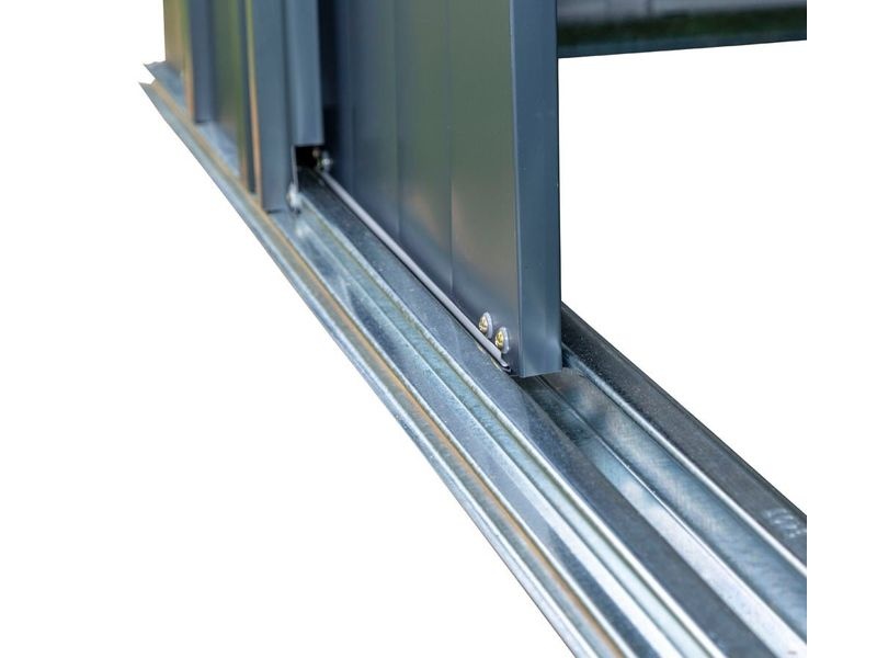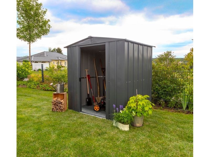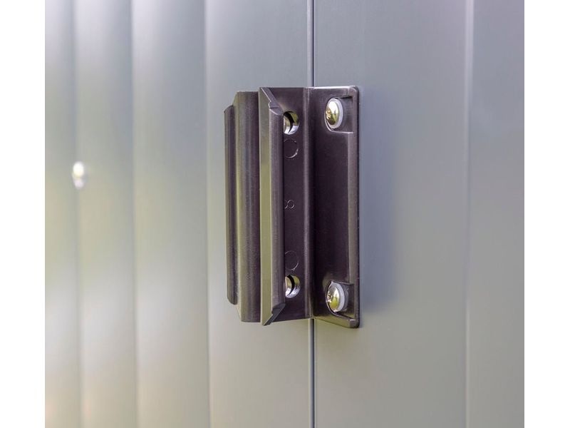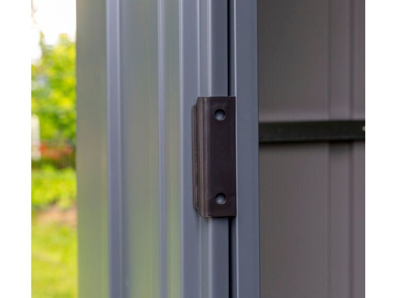 Záhradný domček je vyrobený z elektrolyticky pozinkovaného oceľového plechu. Štýlovú kôlňu dopĺňajú dvojité posuvné dvere, s ktorými sa ľahko manipuluje vďaka madlu na oboch dverách. Vnútorné posuvné dvere, ktoré šetria miesto, zároveň uľahčujú otváranie a zatváranie. Zariadenie na visiaci zámok umožňuje zabezpečiť vnútorné vybavenie (visiaci zámok nie je súčasťou dodávky).