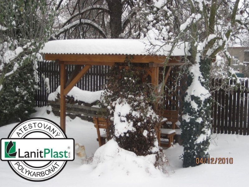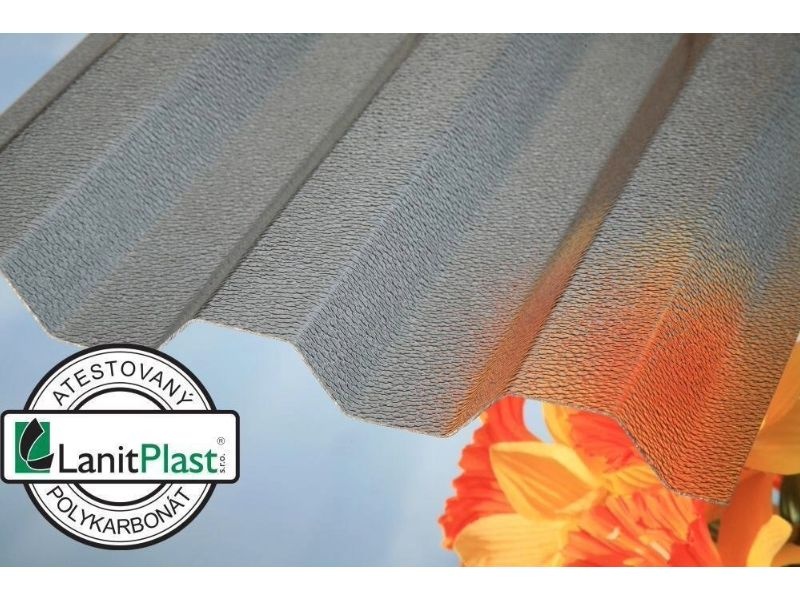 Trapézová polykarbonátová doska s povrchovou krupicou na vnútornej strane (určenou pre rozptyl svetla). Profil 76/16. Povrchová krupička láme svetlo, takže dosky nie sú úplne priehľadné, ale priesvitné. Vzniká pod nimi príjemný jemný chládok pri zachovaní svetelnej priepustnosti.