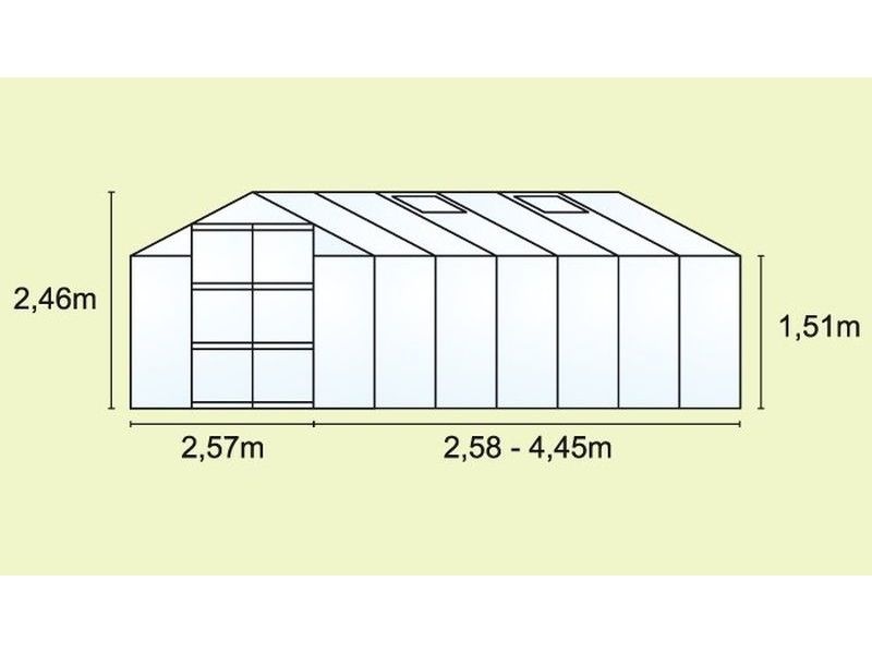 Skleník ke stene je vybavený: jednokrídlovými dverami (rozmer š. 122 × v. 191 cm), AL profilmi, polykarbonátom, 2 oknámi s manuálnym otváraním, všetkým spojovacím materiálom + pozinkovanou základňou.