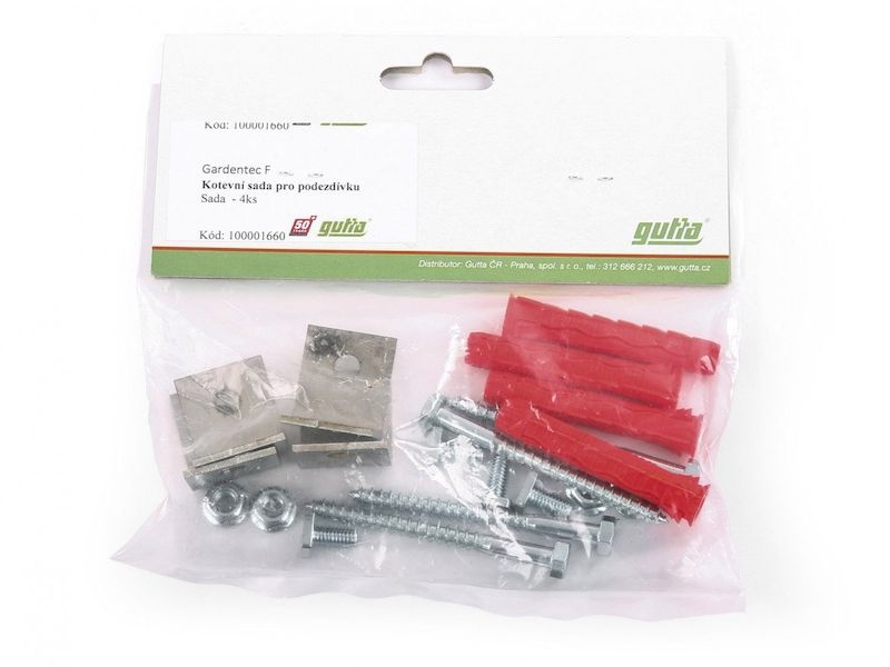 Originálna sada uholníkov, skrutiek a hmoždiniek určená na jednoduché ukotvenie skleníka Gardentec F k podkladu z pevného materiálu.