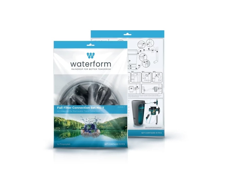 Doplnkové sady príslušenstva pre sudy na vodu rady Waterform (dodávateľ Prosperplast). Sady obsahujú komponenty na zachytávanie a zber, prívod či odvod dažďovej vody zo / do sudu.