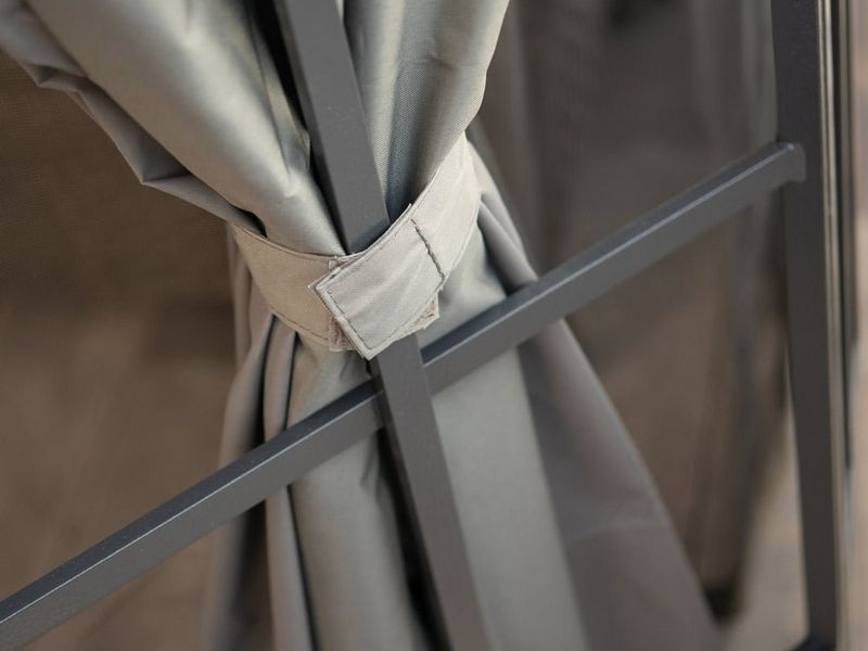 V zatvorenom stave sú závesy pripevnené iba pomocou klipov. Vchod na zips je na každej strane altánku. Súčasťou dodávky sú záclony a upevňovacie klipy.