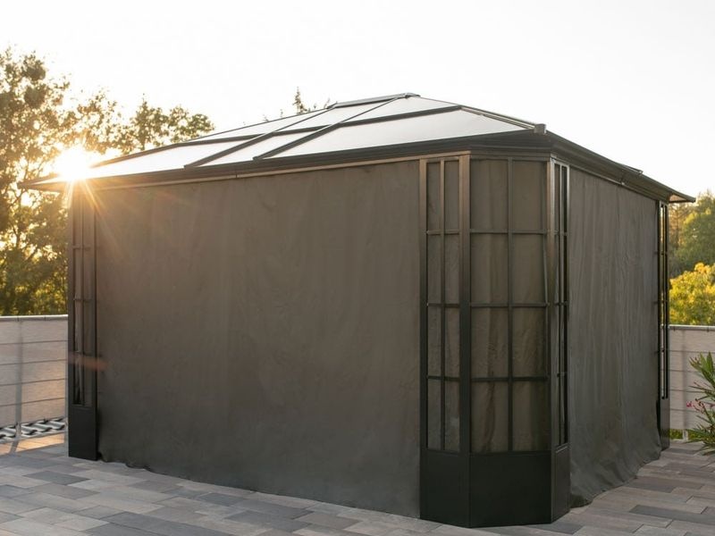 Sada závesov je určená pre celý altánok. Pokrýva všetky strany, pričom závesy sú pripevnené na inú koľajnicu než siete proti hmyzu pomocou dvojitého koľajnicového systému. Tým zaisťujú jednoduchšiu manipuláciu.