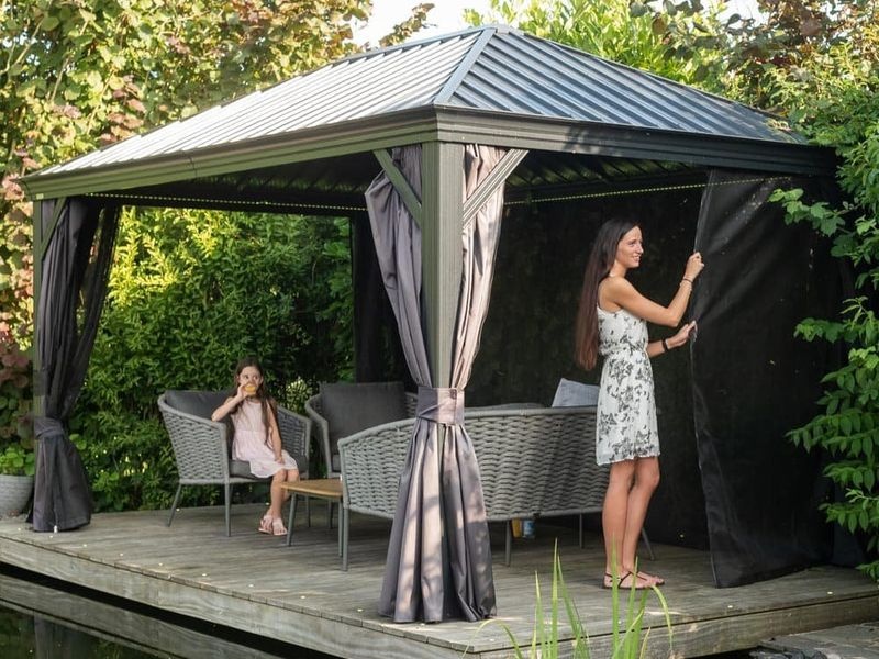 Sada závesov je určená pre celý altán. Pokrýva všetky strany, pričom závesy sú pripevnené na inú koľajnicu než siete proti hmyzu pomocou dvojitého koľajnicového systému. Tým zaisťujú jednoduchšiu manipuláciu.