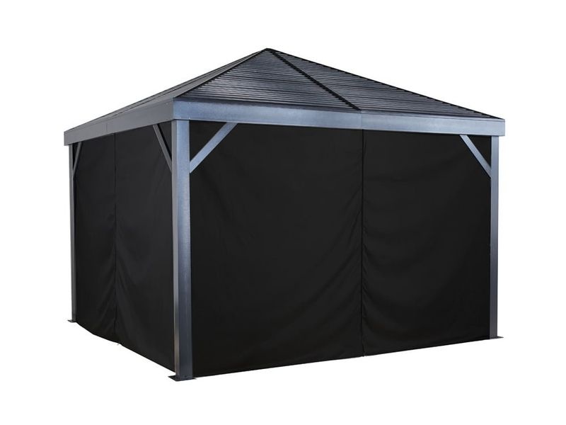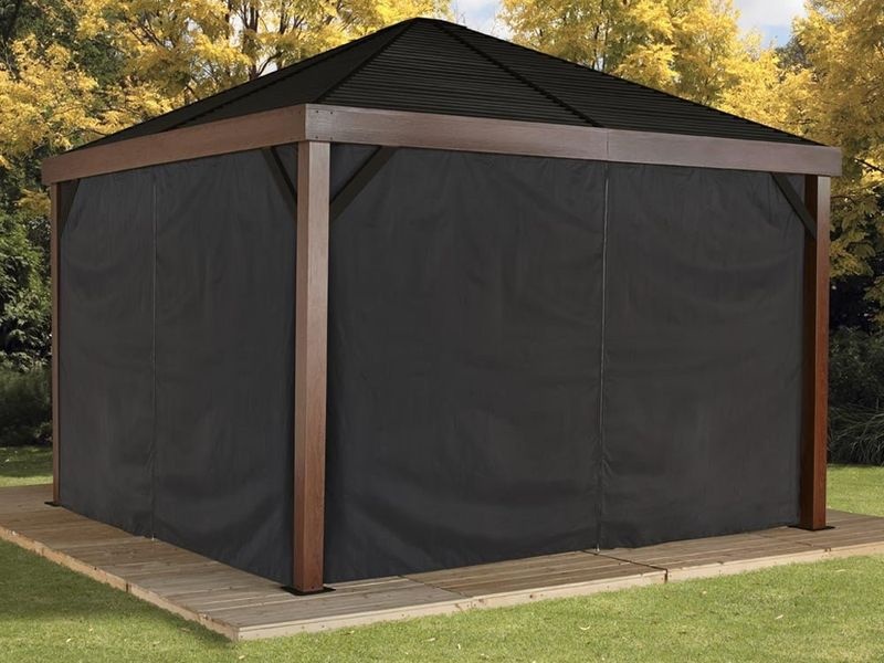 Sada závesov je určená pre celý altán. Pokrýva všetky strany, pričom závesy sú pripevnené na inú koľajnicu ako siete proti hmyzu pomocou dvojitého koľajnicového systému. Tým zabezpečujú jednoduchšiu manipuláciu.