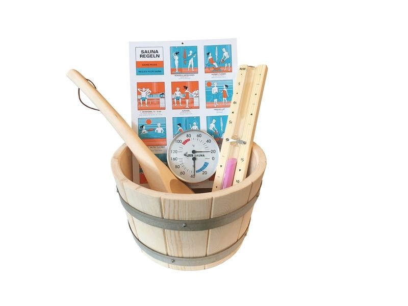 Balíček doplnkov a príslušenstva do vašej sauny. Balenie obsahuje teplomer, saunové hodiny, lopatka na vodu, vedro.