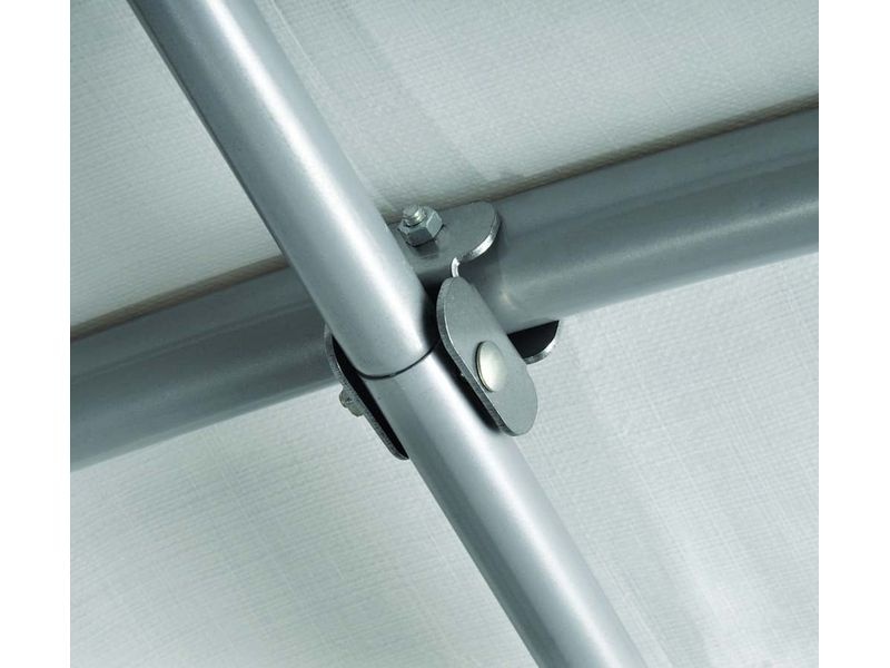Plachta na konštrukciu garáže je vyrobená z trojvrstvového tkaného polyetylénu s plošnou hmotnosťou 210 g/m². Samozrejmosťou je obojstranná 2UV ochrana, ktorá chráni plachtu pred škodlivými účinkami slnečného žiarenia (UV blokátory zabraňujú vyblednutiu plachty). Vďaka špeciálnemu tesneniu (bez švov) je nepremokavá.