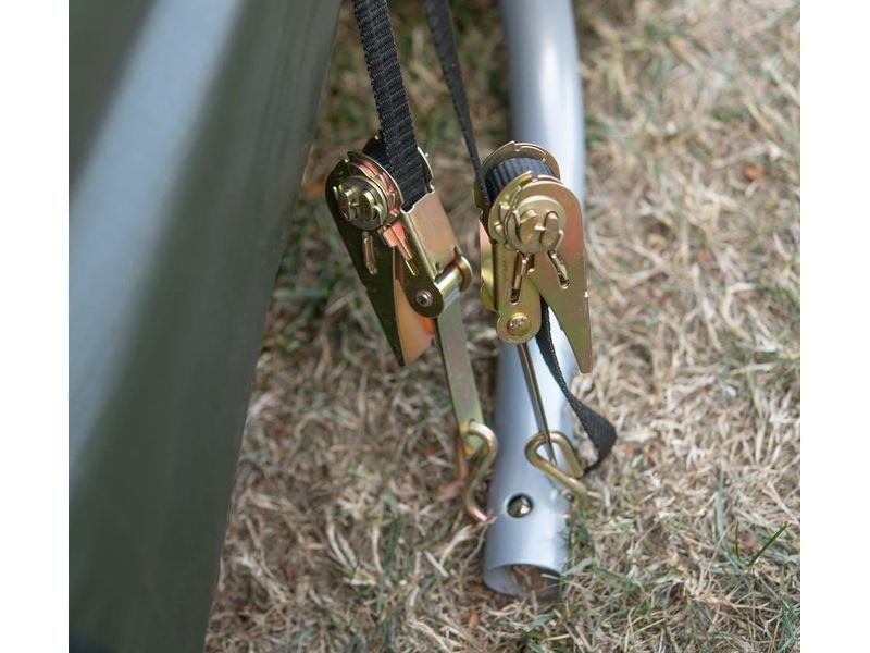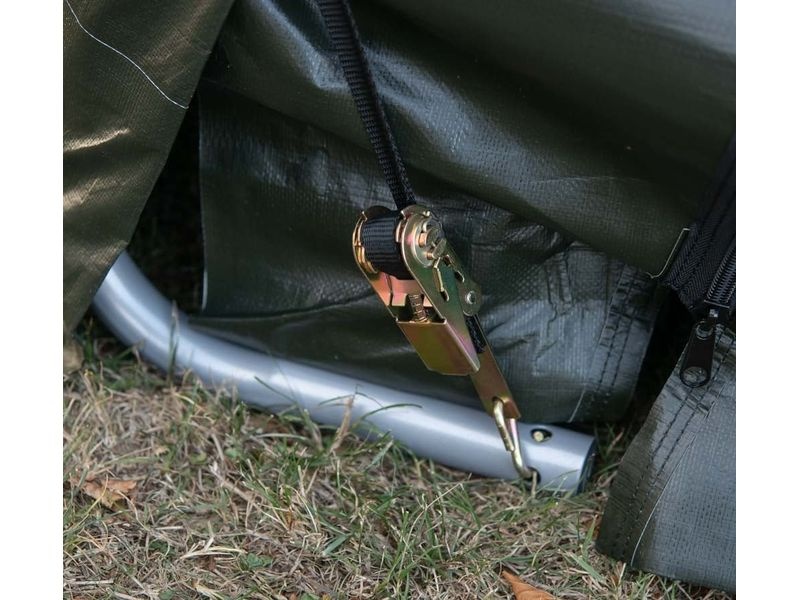 Konštrukcia plachty je zabezpečená upínacími západkami a vstupný otvor (š. 260 × v. 210 cm) je vybavený dvoma zipsami a gumovými uzávermi na jednoduché otváranie/zatváranie. Súčasťou balenia je kompletná kotviaca súprava vrátane štyroch kotiev s dĺžkou 38 cm. Tiež 8 upevňovacích popruhov na upevnenie plachty k rámu vo vetre a v poveternostných podmienkach.