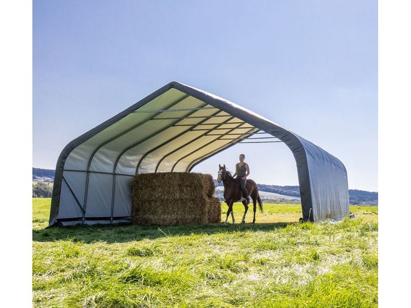Plachtový prístrešok pre dobytok je ideálny na ochranu zvierat pred nepriaznivým počasím a poskytuje príjemný tieň počas slnečných letných dní. Prístrešok je ideálny pre kone, ovce a kravy alebo ako stan na uskladnenie slamy, sena alebo strojov.