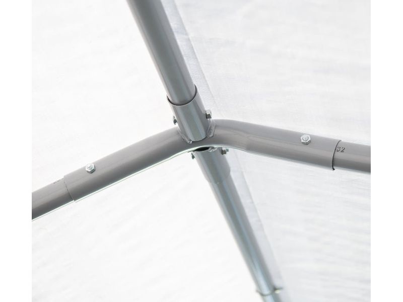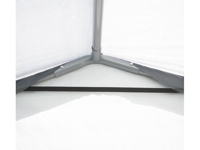 Konštrukcia plachty je zaistená upínacími račňami a vstupný otvor (š. 240, 180 × v. 190 cm) je vybavený dvoma zipsami a gumovými uzávermi pre jednoduché otváranie/uzatváranie. V balení nájdete kompletnú kotviacu sadu, zahŕňajúcu štyri kotvy o dĺžke 38 cm. Tiež 8 upevňovacích popruhov, ktoré slúžia na zabezpečenie plachty k rámu pri vetre a poveternostných podmienkach. Zosilnená zadná stena zaisťuje dodatočnú stabilitu.