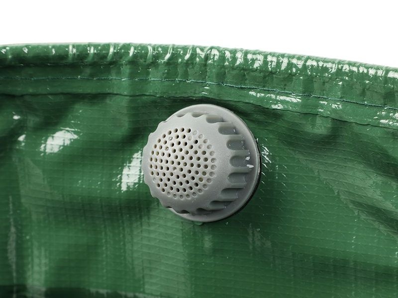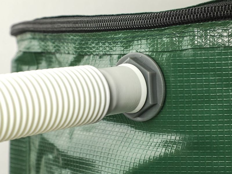 Sud je vyrobený z pevného PVC a podopretý stabilným rámom z 8 PVC tyčí (Ø 20 mm). Veko je opatrené zipsom a integrovanou mriežkou proti nečistotám. Dva praktické odtokové ventily umožňujú pripojenie hadice alebo pohodlné plnenie kanvy. Sud je vybavený aj prepadom, ktorý zabraňuje preplneniu. Vďaka jednoduchému montážnemu systému zvládnete stavbu počas krátkej chvíle bez použitia špeciálneho náradia.
