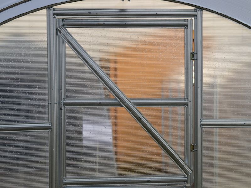 Malé rozstupy oblúkov zaručujú vysokú nosnosť celej konštrukcie skleníka. Predná a zadná strana skleníka má zabudované dvojité dvere, takže skleníkom možno prechádzať z oboch strán. Ak otvoríte hornú časť dverí na oboch koncoch skleníka, zabezpečíte tým pohodlné vetranie celého skleníka bez toho, aby doň mali prístup deti alebo domáce zvieratá.