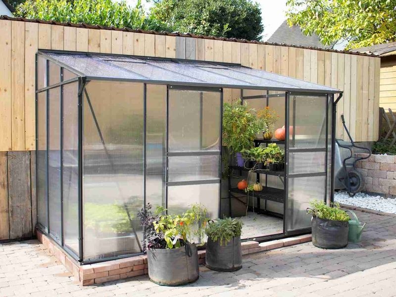 Polykarbonátový stenový skleník je vybavený jedným strešným oknom a posuvnými dvojkrídlovými dverami (rozmery 1,22 × 1,63 cm). Tie umožňujú príjemný prístup do všetkých častí skleníka. Strešné okno s ručným otváraním zabezpečuje vetranie a cirkuláciu vzduchu.