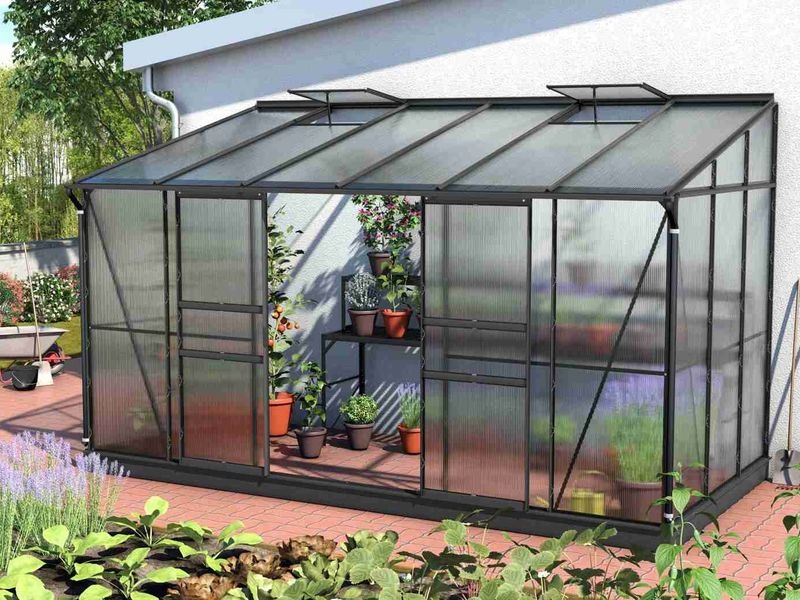 Polykarbonátový stenový skleník je vybavený dvoma strešnými oknami a posuvnými dvojkrídlovými dverami (rozmery 1,22 × 1,63 cm). Tie umožňujú príjemný prístup do všetkých častí skleníka. Strešné okna s ručným otváraním poskytujú vetranie a cirkuláciu vzduchu.