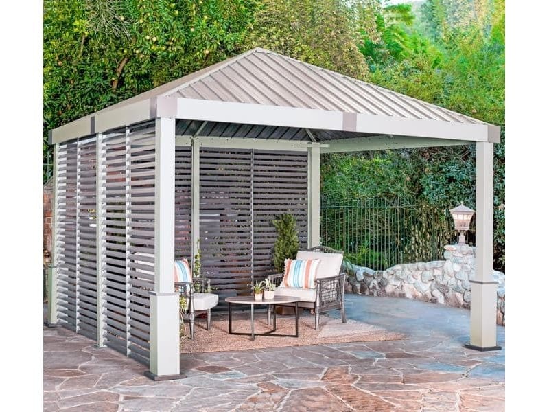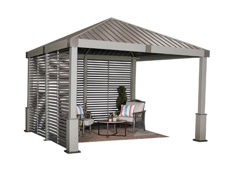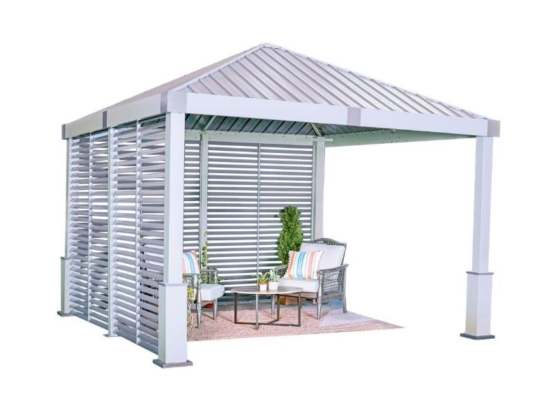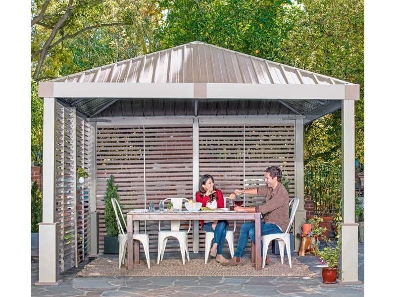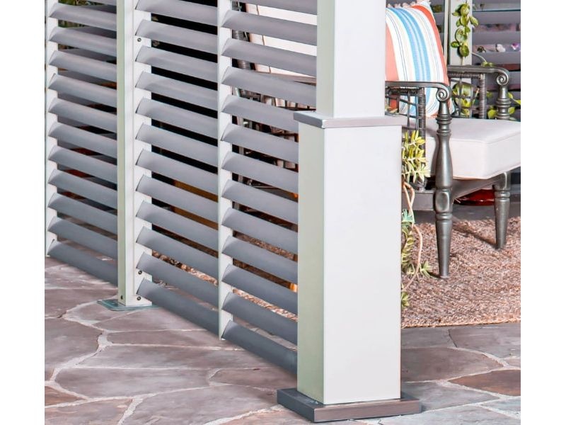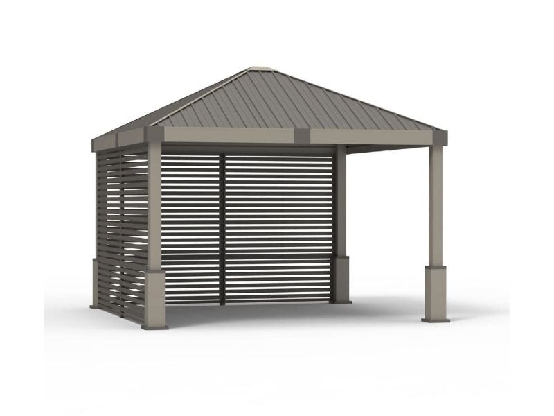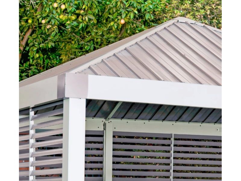 Konštrukciu altánu dopĺňajú bočné steny so šikmými lamelami z kvalitného hliníka. Poskytujú príjemný tieň a navodzujú stredomorskú atmosféru.