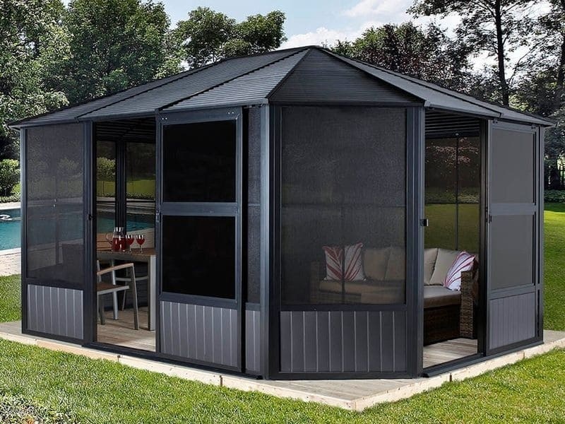 Súčasťou altánku sú aj posuvné dvere, ktoré je možné flexibilne umiestniť na ktorúkoľvek stranu. Na každú stranu je však možné nainštalovať iba jedny dvere.
