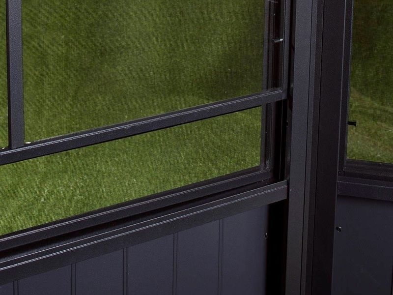 Vetranie a prienik svetla zabezpečuje 10 okien – jedno v každom stenovom paneli (šírka 94 × výška 74 cm). Každé z nich pozostáva z moskytiéry a PVC fólie odolnej voči roztrhnutiu. Pre vetranie ju možno jednoducho zasunúť a na čistenie ľahko odstrániť v dvoch krokoch. Môžete si tak vychutnať výhľad do záhrady aj počas dažďa a dopriať si chvíľku pokoja.