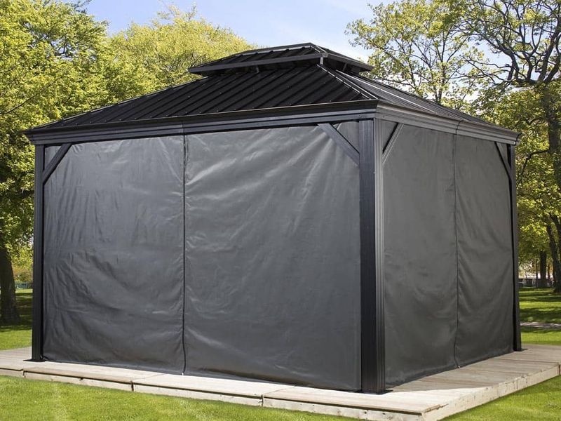 Súprava závesov je určená pre celý altánok. Pokrýva všetky strany, pričom závesy sú pripevnené na inú koľajnicu než siete proti hmyzu pomocou dvojitého koľajnicového systému. Tým zaisťujú jednoduchšiu manupuláciu.