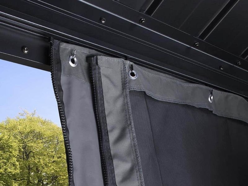 V zatvorenom stave sú závesy pripevnené iba pomocou klipov. Vchod na zips je na každej strane altánku. Súčasťou dodávky sú záclony a pripevňovacie klipy.