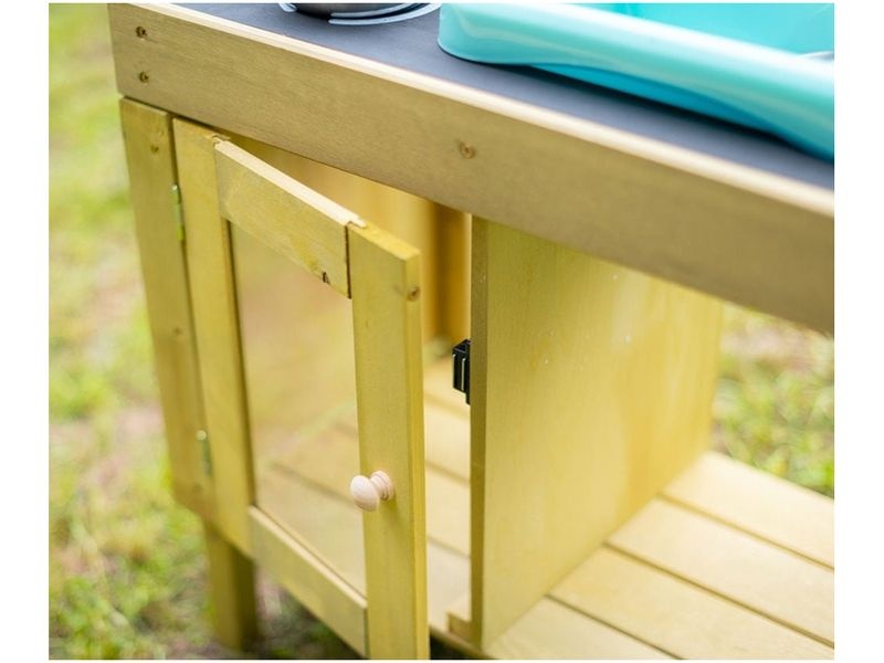 Kuchynka Ladybug je vyrobená z borovicového dreva s certifikáciou FSC®, čo zaručuje vysokú kvalitu a trvácnosť. Drevo je ošetrené tak, aby odolalo vonkajším vplyvom, čo umožňuje jej celoročné využitie vonku aj vo vnútri.