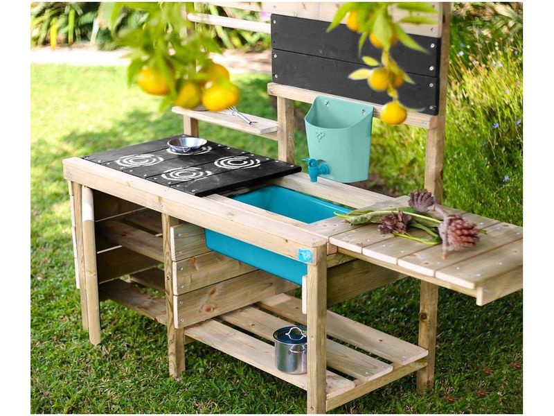 Kuchyňka Marmot je vyrobena z borovicového dřeva s certifikací FSC®, což zajišťuje vysokou kvalitu a trvanlivost. Dřevo je ošetřeno tak, aby odolalo vnějším vlivům, což umožňuje její celoroční využití venku i vevnitř.