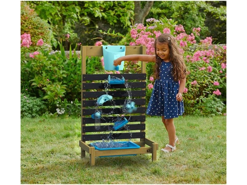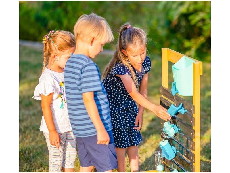 Vodní stěna umožňuje dětem objevovat, jak funguje pohyb vody přes různé stanice a překážky. Děti si mohou samy naplnit velkorysý vodní zásobník, sledovat, jak voda protéká, a zachytit ji do odnímatelného sběrného kontejneru, který umožňuje opakované použití vody, čímž šetříte čas i zdroje.