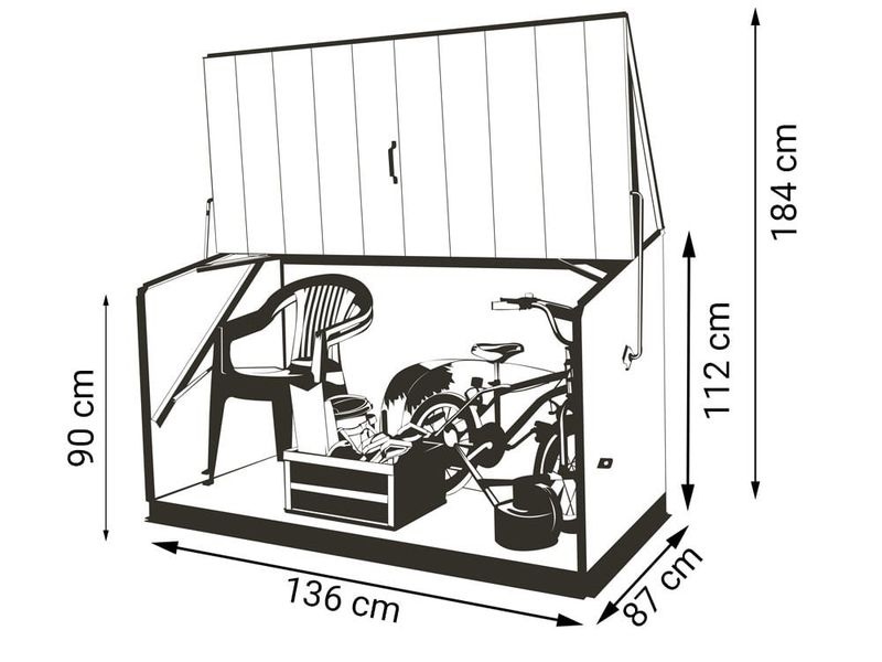 Kovový úložný box Stowaway je praktickým riešením na bezpečné uskladnenie záhradnej techniky, náradia aj bicyklov. Vďaka kompaktným rozmerom sa hodí na záhradu, k domu alebo do menších priestorov.
