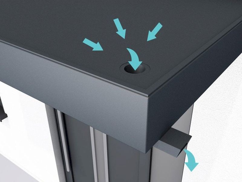 Do striešky nad dverami je integrovaný odtok pre plynulý odtok vody z povrchu striešky. V prípade samostatného použitia je strieška dverí vybavená chrličom, ktorý odvádza dažďovú vodu mimo pôdorysu striešky.