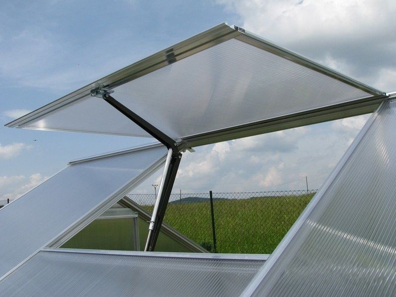 Dodatočné strešné okno pre záhradné skleníky Gardentec F. Rám okna je vyrobený rovnako ako celý skleník Gardentec z hliníkových ALU profilov.
