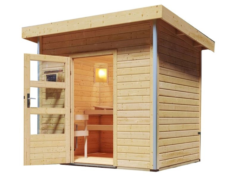 Vonkajší model fínskej sauny pre vašu záhradu. Moderný dizajn s chrómovými rohovými lištami.