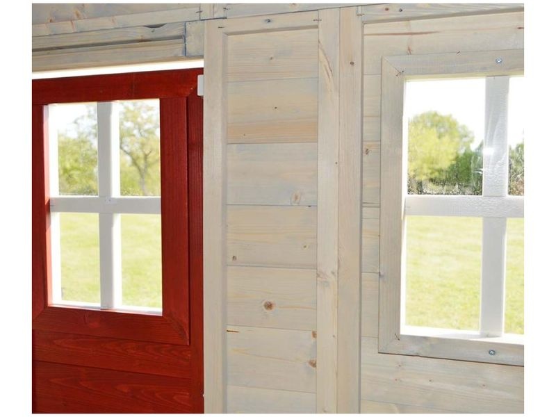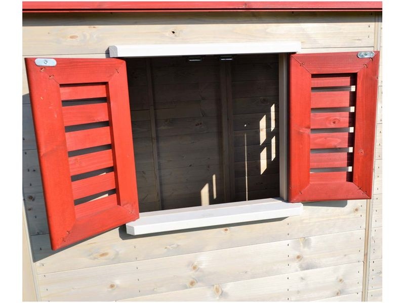Domček na hranie zaujme svojím prirodzeným vzhľadom z borovicového dreva. Jedno mrežové okno z plexiskla a druhé okno s okenicami dodávajú domčeku jedinečný a atraktívny vzhľad, ktorý deti očarí.