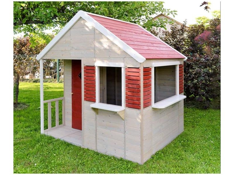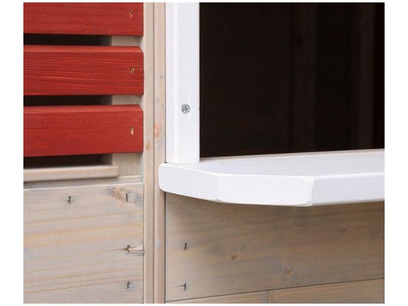 Domček na hranie zaujme svojím prirodzeným vzhľadom z borovicového dreva. Jedno okno s kvetinovým boxom a druhé okno s pruhovanou markízou dodávajú domčeku jedinečný a atraktívny vzhľad, ktorý deti očarí.