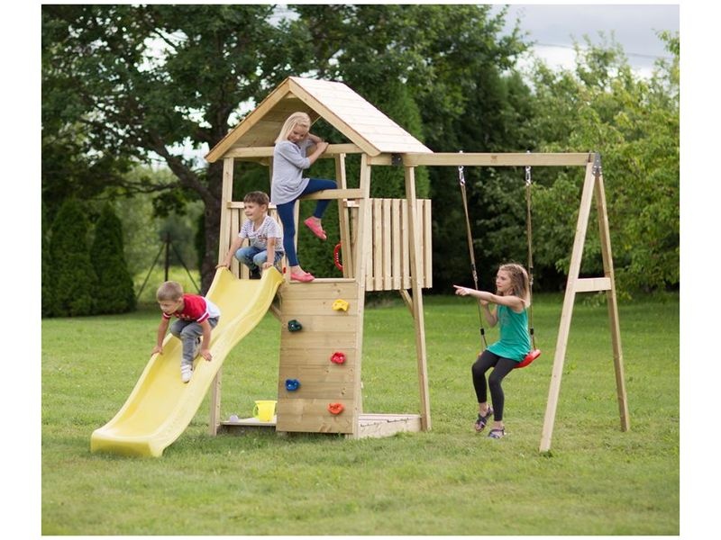 Konštrukcia je vybavená šmykľavkou, ku ktorej vedie rebrík i lezecká stena. V interiéri je možné vytvoriť úkryt pre imaginárne hry, zatiaľ čo hojdačka rozširuje spektrum pohybových aktivít. V spodnej časti konštrukcie je umiestnené pieskovisko, ktoré poskytuje ďalšie herné možnosti.