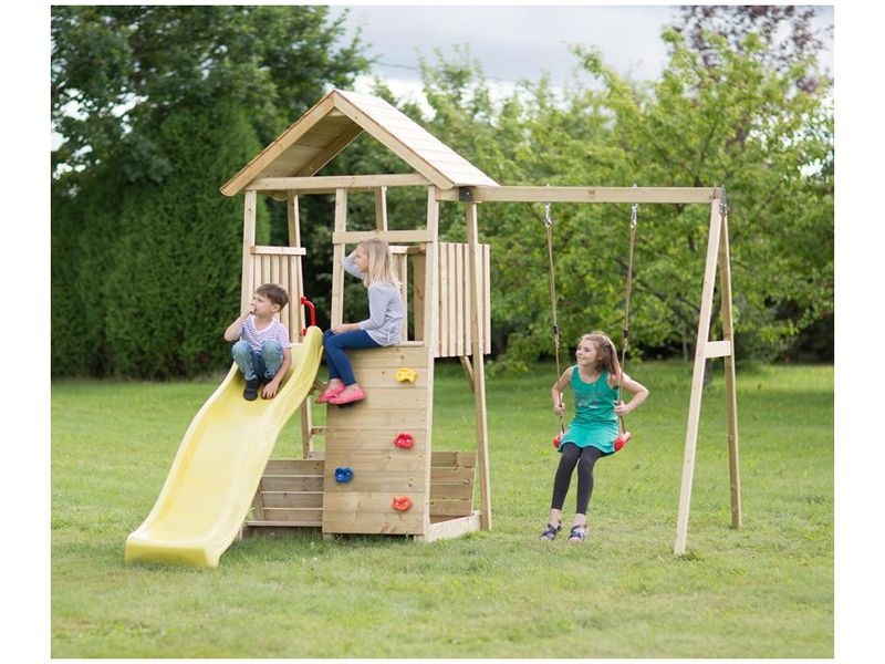 Herná veža s rozmermi 280×270×270 cm predstavuje praktický a atraktívny doplnok záhradného priestoru. Súčasťou konštrukcie je šmykľavka s hojdačkou, lezeckou stenou a pieskoviskom, čo deťom poskytuje široké spektrum možností na fyzické aktivity i tvorivé hry. Ide o vhodné miesto pre dobrodružné zážitky a rozvoj fantázie, ktoré spoľahlivo zaujme a zabaví.