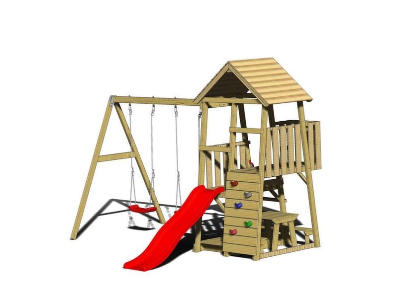 Herná veža je vybavená šmykľavkou, ku ktorej vedie rebrík aj lezecká stena. Vaše dieťa si môže v domčeku vytvoriť tajný úkryt alebo sa zapojiť do rôznych kreatívnych hier. Okrem toho si deti môžu užiť množstvo zábavy na hojdačke. Pod vežou sa nachádza piknikový stôl.