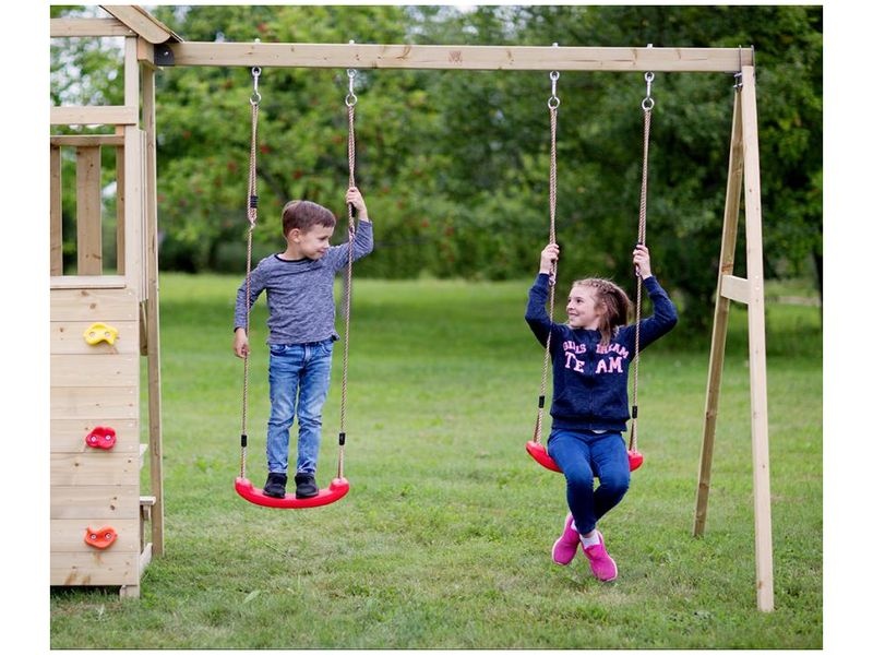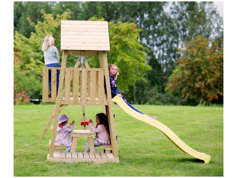 Herná veža je vybavená šmykľavkou, ku ktorej vedie rebrík aj lezecká stena. Vaše dieťa si môže vo veži vytvoriť tajný úkryt alebo sa zapojiť do rôznych kreatívnych hier. Okrem toho si deti môžu užiť množstvo zábavy na dvoch hojdačkách.