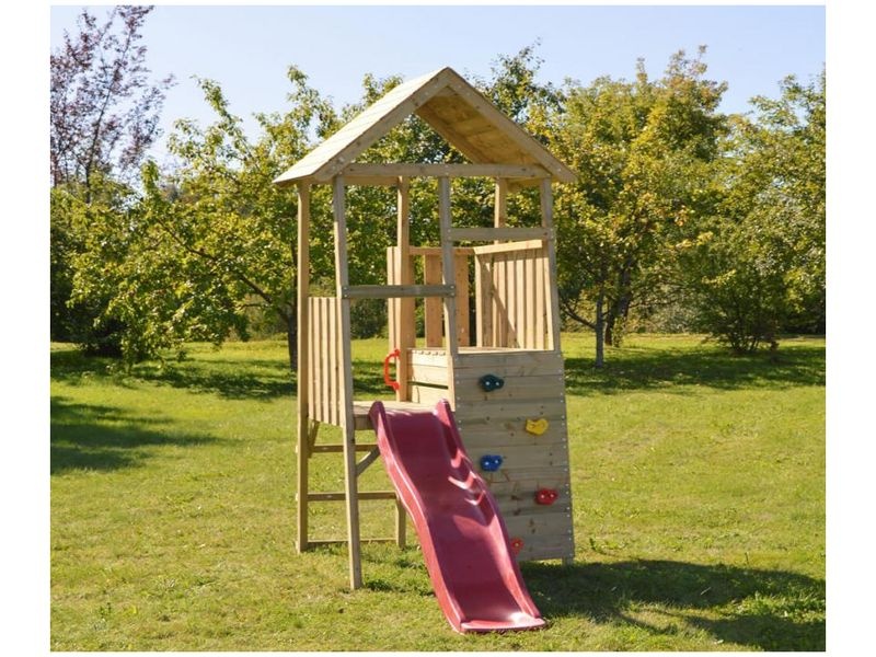 Herná veža je vybavená šmykľavkou, ku ktorej vedie rebrík aj lezecká stena. Vaše dieťa si môže v domčeku vytvoriť tajný úkryt alebo sa zapojiť do rôznych kreatívnych hier. Okrem toho si deti môžu užiť množstvo zábavy na vstavanej pódiu.