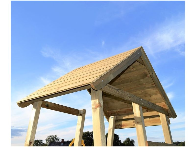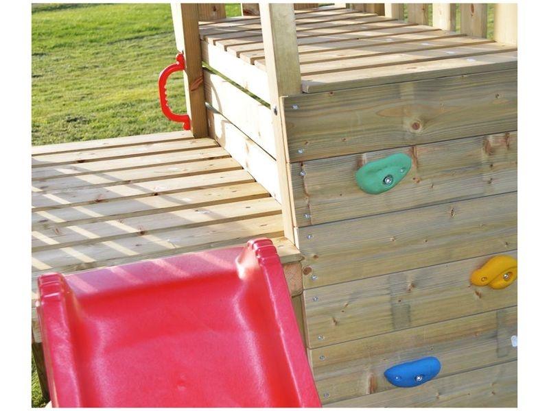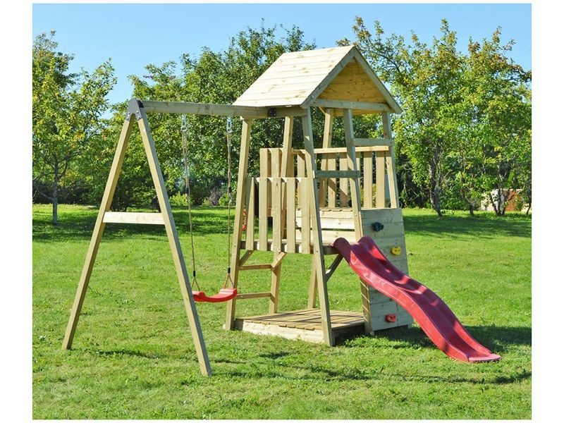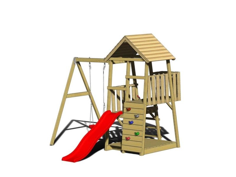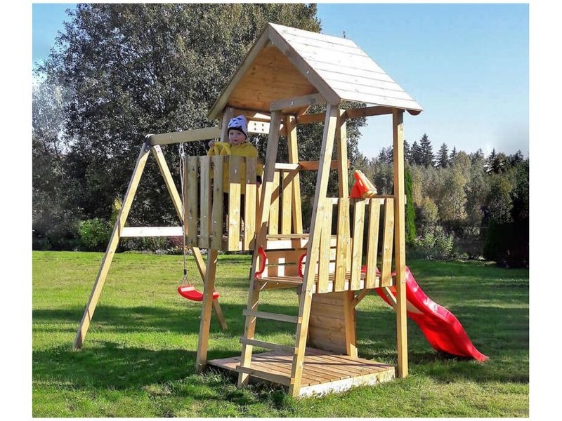 Herná veža je vybavená šmykľavkou, ku ktorej vedie rebrík aj lezecká stena. Vaše dieťa si môže v domčeku vytvoriť tajný úkryt alebo sa zapojiť do rôznych kreatívnych hier. Okrem toho si deti môžu užiť množstvo zábavy na hojdačke.
