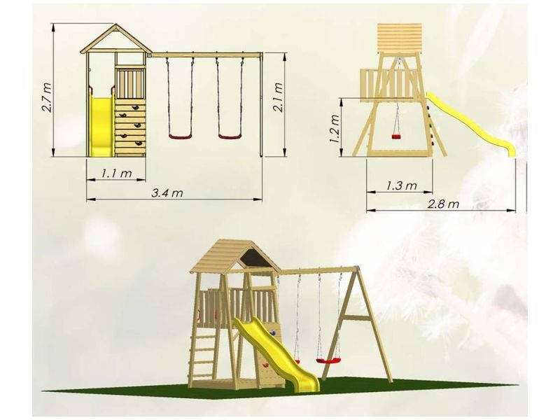 Herná veža s rozmermi 280×340×270 cm je praktickým a zábavným doplnkom do vašej záhrady. Súčasťou veže je šmykľavka s hojdačkami, lezeckou stenou a pieskoviskom, čo deťom poskytuje skvelé možnosti na hranie. Je ideálnym miestom pre dobrodružstvá a kreatívnu hru, ktorá vaše deti poteší a zabaví.