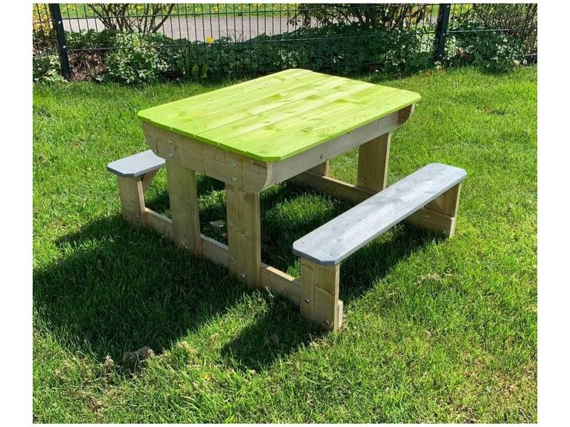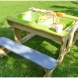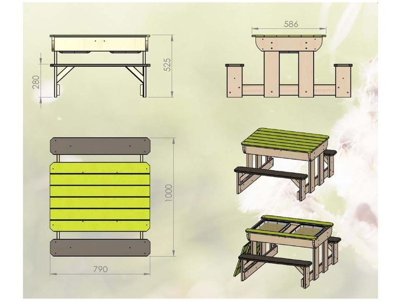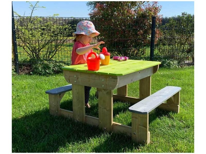 Sedacia súprava s rozmermi 80×100×53 cm je praktickým a zábavným doplnkom do vašej záhrady. Súčasťou sú pod poklopom dve vyberateľné hracie nádoby, čo deťom poskytne skvelé možnosti na hranie. Lavice sú ku stolíku pevne pripevnené. Je ideálnym miestom pre dobrodružstvo a kreatívnu hru, ktorá vaše deti poteší a zabaví.