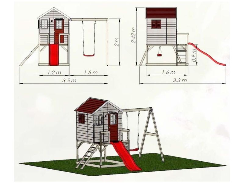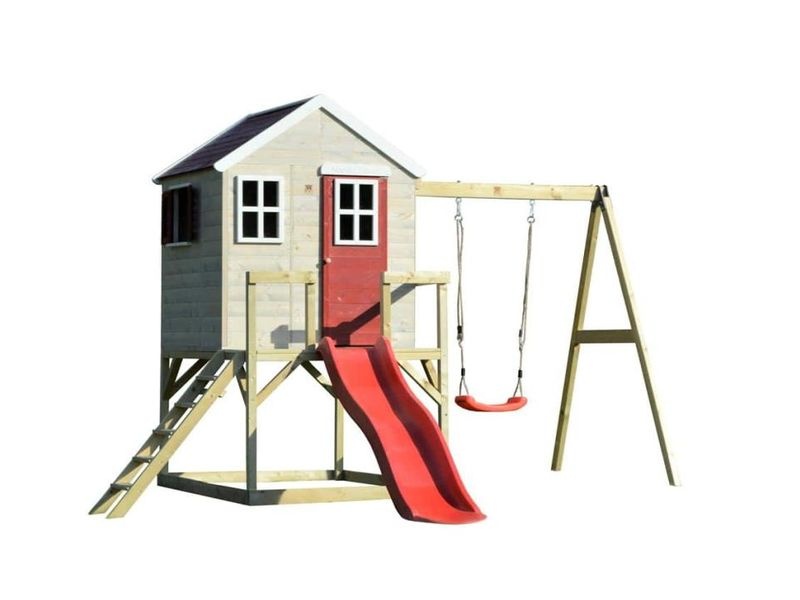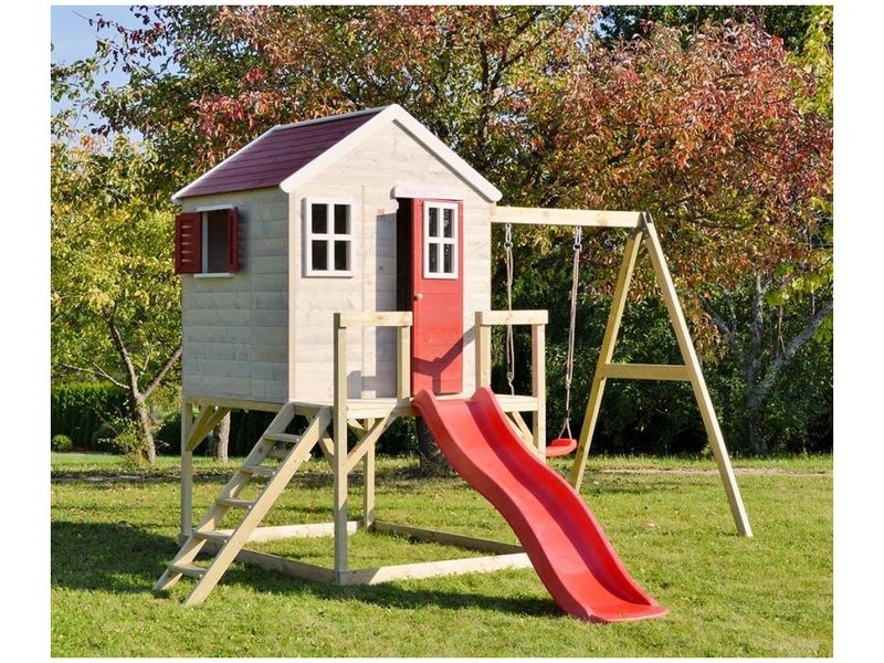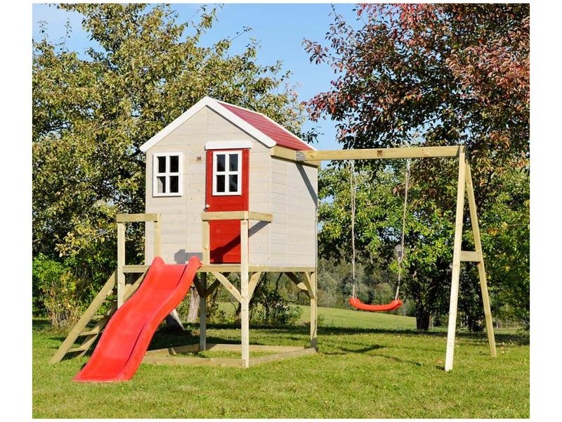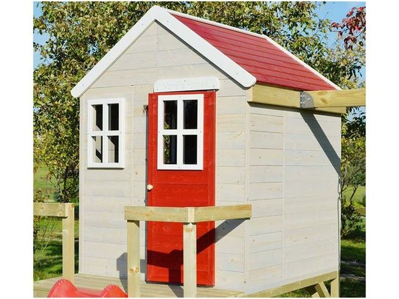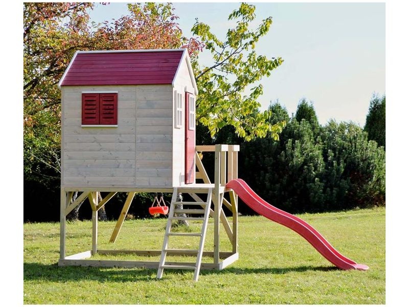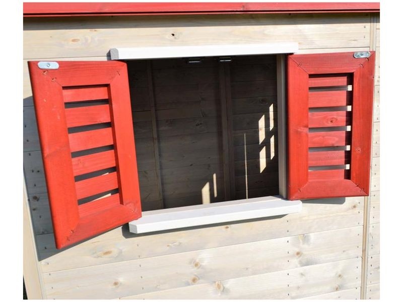 Domček je vybavený šmykľavkou (ku ktorej vedie rebrík) a krytým pieskoviskom, ktoré ponúka nekonečné možnosti na hry a zábavu. Pieskovisko je chránené domčekom nad ním, čo umožňuje jeho použitie aj pri miernom daždi. Vaše dieťa si môže v domčeku vytvoriť tajný úkryt alebo sa zapojiť do rôznych kreatívnych hier.