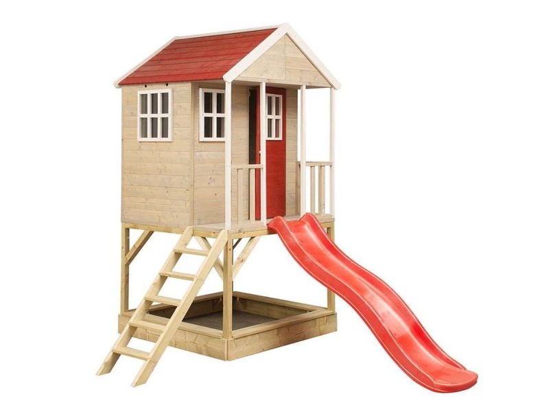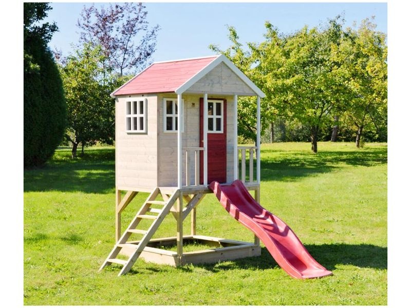 Domček je vybavený šmykľavkou (ku ktorej vedie rebrík) a krytým pieskoviskom, ktoré ponúka nekonečné možnosti na hry a zábavu. Pieskovisko je chránené domčekom nad ním, čo umožňuje jeho použitie aj pri miernom daždi. Vaše dieťa si môže v domčeku vytvoriť tajný úkryt alebo sa zapojiť do rôznych kreatívnych hier.