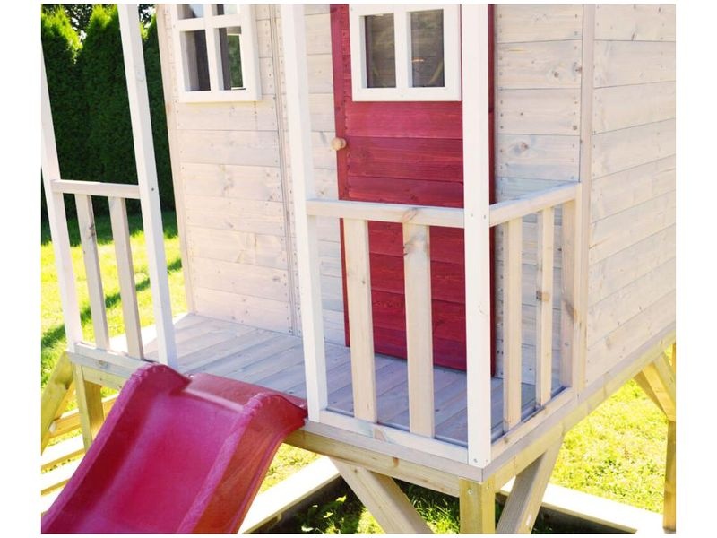 Domček na chôdach vyniká svojím prírodným vzhľadom, ktorý zaujme ako deti, tak dospelých. Vďaka dvom malým okienkam z plexiskla a verande s červenými vstupnými dverami je tento domček nielen funkčný, ale aj vizuálne atraktívny.