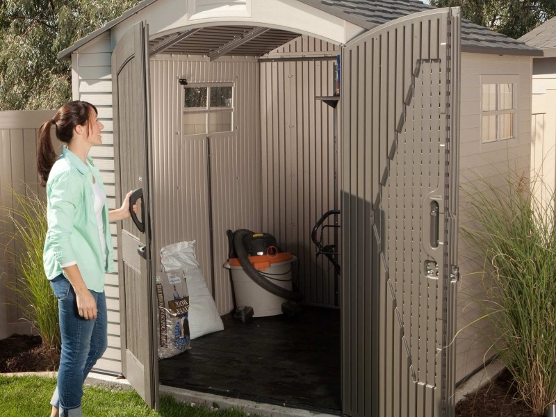 Súčasťou dodávky je plastová protišmyková podlaha, ktorá chráni uložené vybavenie pred vlhkosťou aj nečistotami. Domček je vybavený dvojkrídlovými dverami (138×192 cm) na pohodlný vstup a manipuláciu aj s väčšími predmetmi.