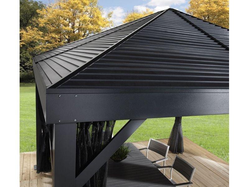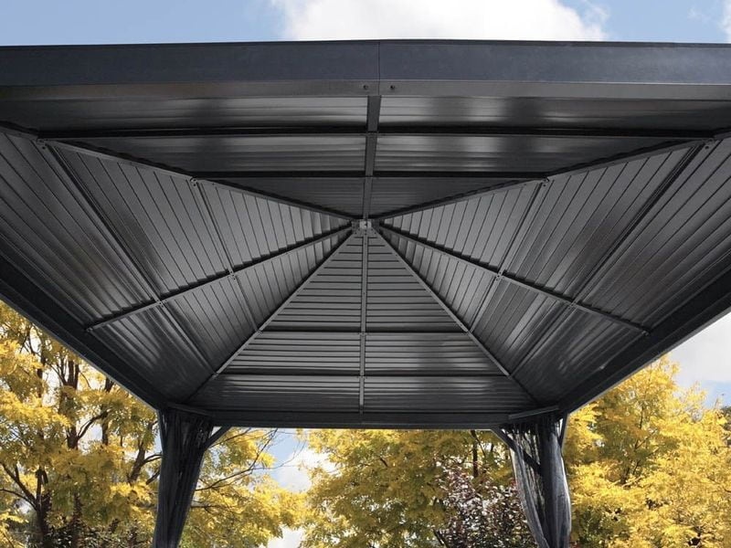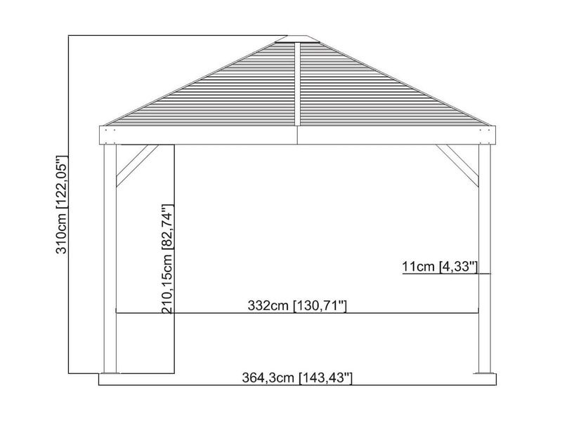 Střecha altánu je vyrobena z odolné pozinkované oceli, která je vždy krásně tvarovaná. Zaručuje obzvláště vysokou stabilitu a snadno odolává povětrnostním podmínkám, jako je déšť, sníh nebo slunce (UV záření). Díky tomu je možné altán nechat na svém místě po celý rok.