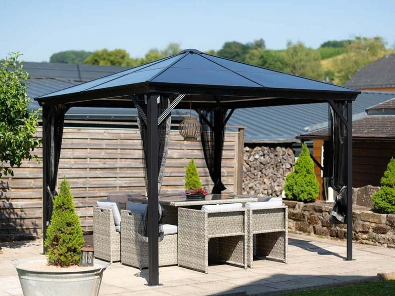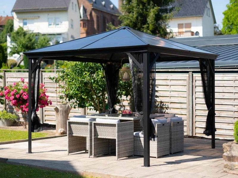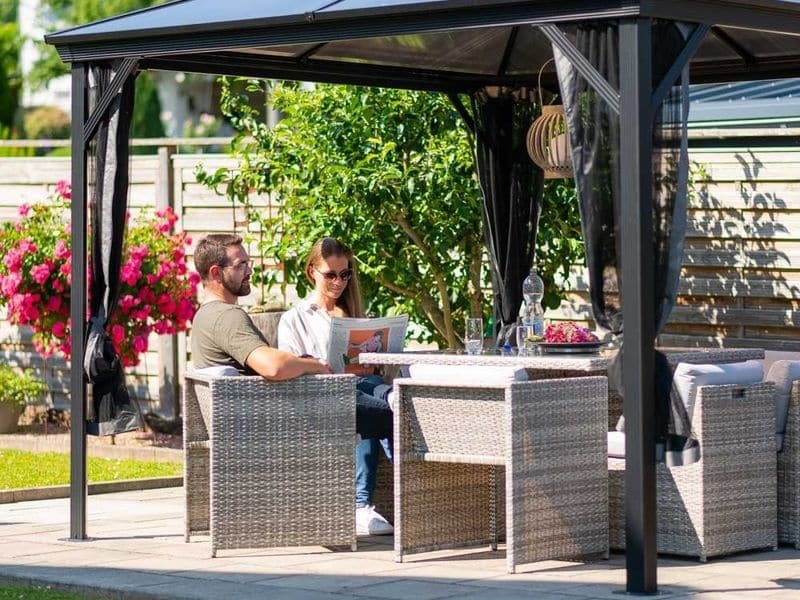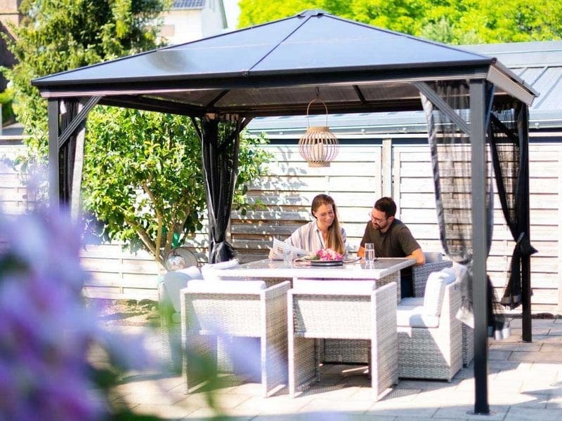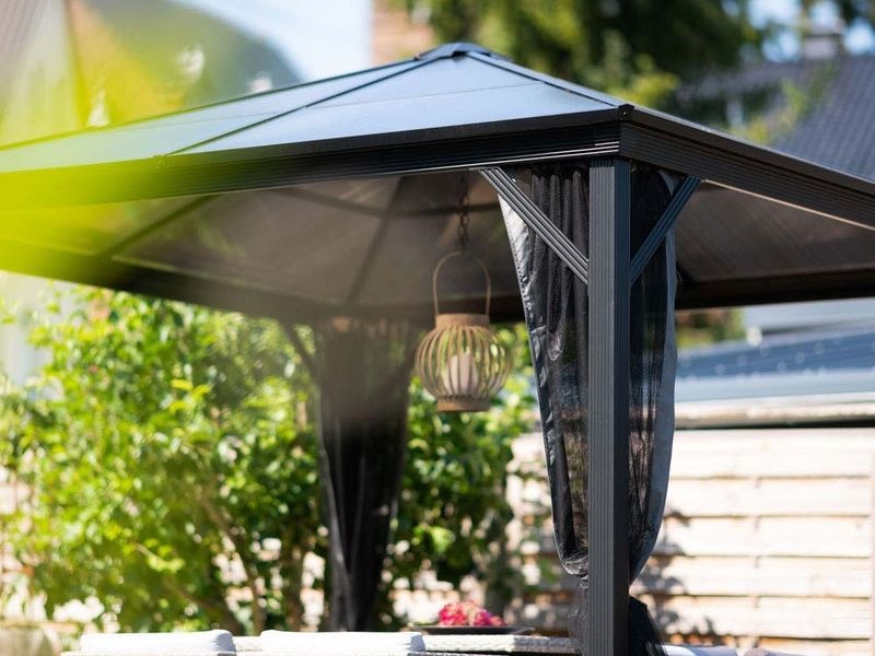 Hliníkový altán vám vytvorí príjemné a útulné miesto na oddych hneď vedľa vášho domu alebo kdekoľvek na záhrade. Je vybavený moskytiérou, ktorá vás počas teplých letných večerov ochráni pred komármi.