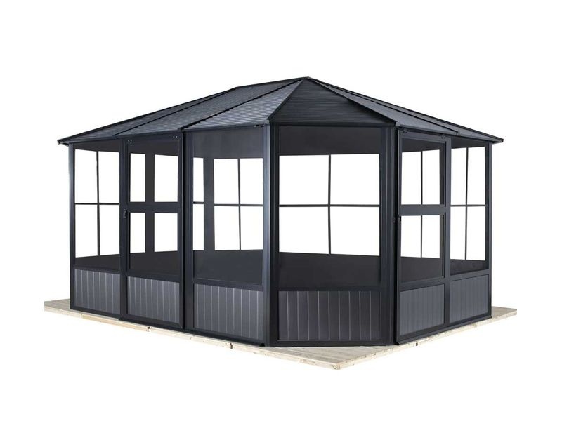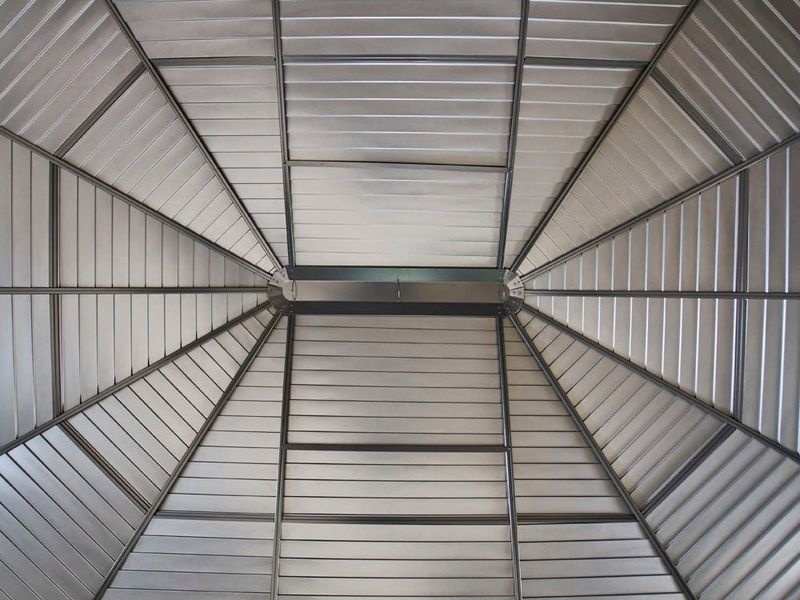 Strecha altánku je vyrobená z kvalitnej pozinkovanej ocele. Zaručuje mimoriadne vysokú stabilitu a ľahko odoláva poveternostným podmienkam, ako je dážď, sneh alebo slnko. Vďaka tomu je možné altánok ponechať na svojom mieste po celý rok.